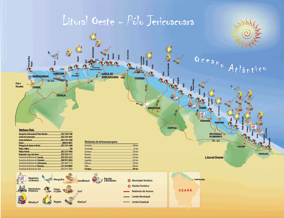 Jericoacoara is a hippie (now touristic) village built on the sand. And is one of the favorite points for kite and wind surf. By 4x4 is the only way to get there, or in a off road truck bus. Jeri offers many activities, buggy trips to visit lagoons where you lay on a hammock, drink a caipirinha, and eat fresh fish, hippie festivals, and dance some forró (local state music).